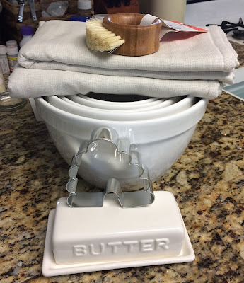 A side note... once I started thinking about homemade butter I decided I needed a butter dish, to have soft butter all the time. Did some searching online and instantly swooned over this embossed one at Sur La Table so I bought it with some of my Christmas money (thanks mom and dad). I also went ahead and bought this beautiful set of white mixing bowls, two linen colored dish towels, a veggie brush, and a beehive cookie cutter. They are all super nice quality and make me hate cooking just a bit less.